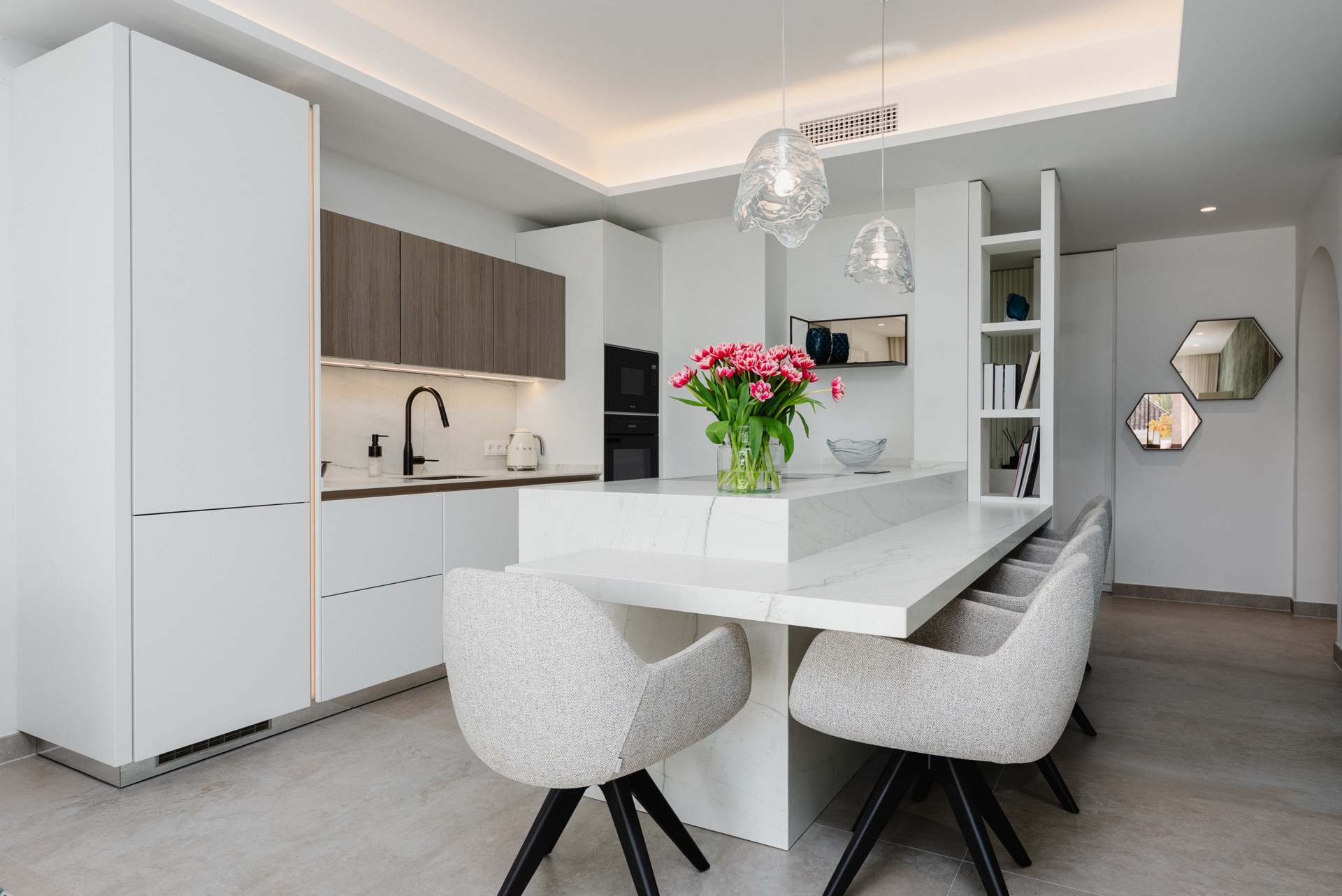 This exceptional apartment In the urbanisation Alhambra del Mar is situated on the first floor of the highly desirable third phase within one of the most iconic and sought-after complexes on Marbella's prestigious Golden Mile. Being a boutique, quiet phase, it offers tranquility while remaining minutes from the seafront promenade, acclaimed restaurants, essential services, top schools, and the bustling town centre. You are just a couple of minutes' walk from the beach near the Gran Meliá Don Pepe area, providing immediate access to premium gastronomy, sports, and leisure. This is a unique opportunity to secure a privileged, safe, and residential location right in the heart of Marbella. Impeccable Design & Renovation Recently launched onto the market, this apartment has undergone a complete, high-end refurbishment. The commitment to quality is evident in every detail, including new electrical wiring, comprehensive PVC plumbing, new carpentry, and premium installations such as: Hot/cold air conditioning. High-quality wooden windows with solar-filter glass. Large-format porcelain flooring and microcement finishes. Bespoke designer lighting throughout. The Interior & Layout The property features a sophisticated, open-plan layout designed for modern living and entertaining. It comprises 3 spacious bedrooms and 2 luxurious bathrooms (one ensuite). The centerpiece is the designer Siematic kitchen fitted with top-of-the-line Miele appliances, a wine cooler, and a ceramic hob with a built-in extractor. This space seamlessly flows into the bright living room, the outdoor dining area, and the covered terrace, creating an interconnected space for relaxation and complete privacy. The interiors were meticulously curated by one of the Costa del Sol's most sought-after interior design studios, complemented by internationally renowned furniture and lighting brands. The bathrooms elevate the experience further with underfloor heating, Porcelanosa tiling, and elegant Italian-designed Inbani furniture. Outdoor Living & Amenities Enjoy the tranquil views from the large terrace overlooking the lush Mediterranean garden and the communal swimming pool. The apartment also benefits from a secondary west-facing balcony. The complex provides residents with a beautiful communal swimming pool, a large private storage room, and communal outdoor parking for several vehicles.